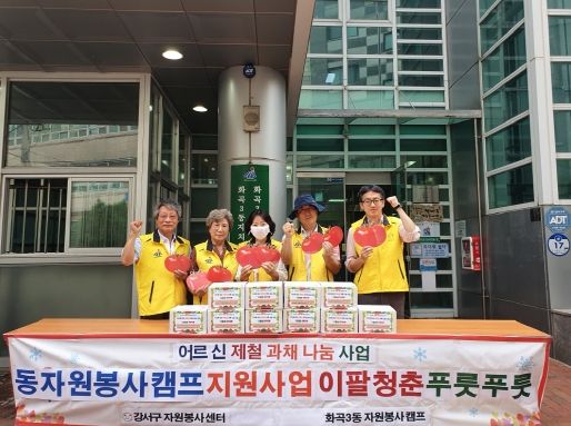 [제주교통복지신문 김강석 기자] 강서구 화곡3동 자원봉사캠프는 지역 내 거동이 어려운 저소득 홀몸 어르신 10가구에 제철 과일을 직접 배달하고 안부를 확인하는 ‘이팔청춘 푸룻푸룻’ 사업을 추진, 훈훈함을 전하고 있다.