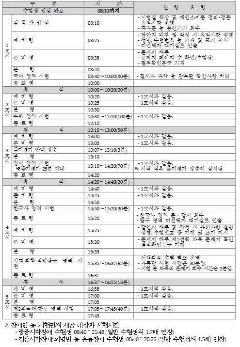 한국사와 탐구 영역 시험에서는 수험생에게 한국사와 탐구 영역 답안지를 분리하여 별도 제공한다. 한국사 영역 시험 시간 종료 후 한국사 영역의 문제지 및 답안지를 회수하고 탐구 영역 문제지 및 답안지를 배부하며, 이를 위한 시간은 15분이 부여된다. 이 시간 중 탐구 영역 미선택자는 대기실로 이동할 수 있다. ※ 시험 시간은 [붙임] 참조