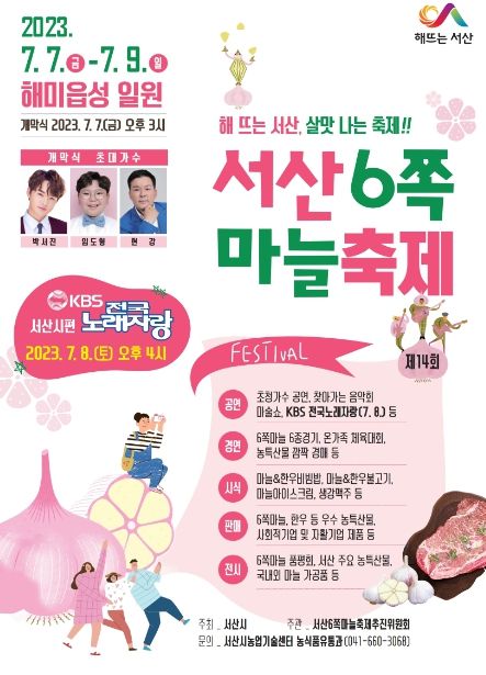 시는 서산6쪽마늘축제추진위원회에서 주관하는 ‘제14회 서산6쪽마늘축제’가 7월 7일부터 9일까지 3일간 해미읍성에서 개최된다고 밝혔다.