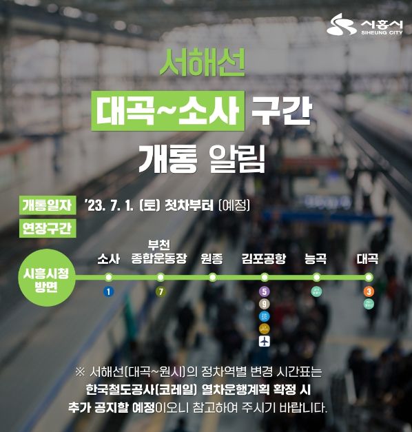 [제주교통복지신문 김강석 기자] 서해선 ‘소사~원시’ 구간이 서해선 ‘대곡~원시’ 구간으로 노선명을 변경·확정하고, 7월 1일부터 소사~대곡 연장구간의 운행이 개통된다. 이에 시흥시(시장 임병택)는 경기 서부~북부 지역 주민들의 교통 여건이 획기적으로 개선될 것이라고 밝혔다.