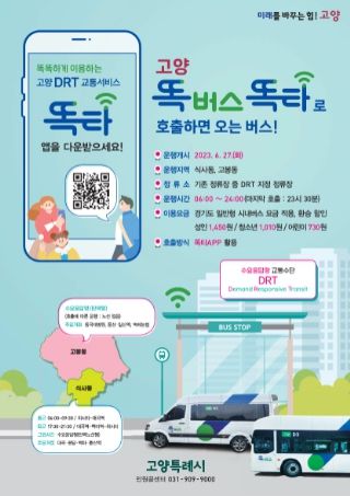 [제주교통복지신문 김강석 기자] 원하는 시간에, 원하는 장소에서 탑승해 원하는 목적지로 이동할 수 있는 신개념 교통수단 ‘똑버스’가 고양 일산동구 식사동‧고봉동에서 운행을 시작한다.