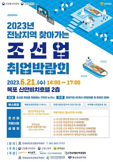 산업통상자원부, 고용노동부, 전라남도가 공동으로 주최한 ‘찾아가는 조선업 취업박람회’는 45개 기업이 참여해 346명을 채용할 예정이다. 조선업 취업을 희망하는 구직자는 누구나 참여할 수 있으며 신분증, 이력서 등을 지참해 오후 2시까지 행사장에 방문하면 된다.
