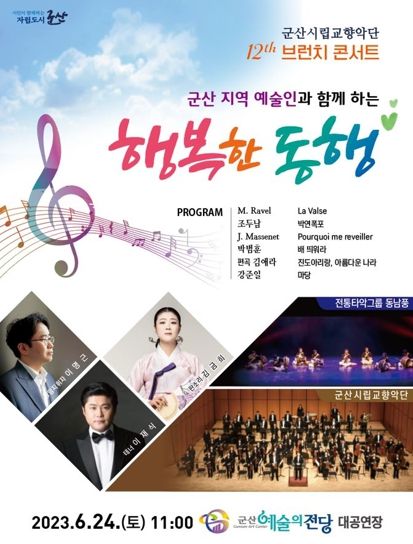 [제주교통복지신문 김강석 기자] 클래식으로 토요일의 여유로움을 즐길 수 있는 군산시립교향악단의 브런치 콘서트 '행복한 동행'이 오는 24일 오전 11시 군산예술의전당 대공연장에서 개최된다.