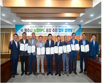 원주시는 식량산업 발전을 위해 지난 19일 시청 투자상담실에서 농협중앙회, 문막·원주·소초·신림·판부·남원주 등 6개 지역 농협과 RPC 통합추진 업무협약을 체결했다.