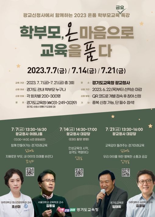 특강 참여를 희망하는 학부모는 22일부터 포스터 하단의 각 회차별 QR코드를 통해 사전 신청을 할 수 있으며 선착순 마감할 예정이다.