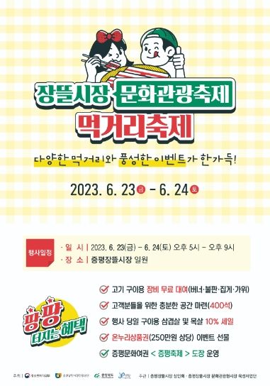 [제주교통복지신문 김강석 기자] 증평장뜰시장은 오는 6월 23일~24일 2일간 증평읍 장뜰로 58-1 일원인 증평장뜰시장 내 행사장에서 전통시장 활성화를 위해 ‘문화관광 먹거리 축제’를 개최한다고 밝혔다.