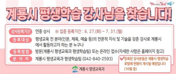 [제주교통복지신문 김강석 기자] 계룡시가 지역사회의 유능한 강사를 발굴하고 효율적 연계를 위한 강사은행을 운영하고자 오는 27일부터 7월 31일까지 평생학습 강사 집중등록기간을 운영한다고 밝혔다.