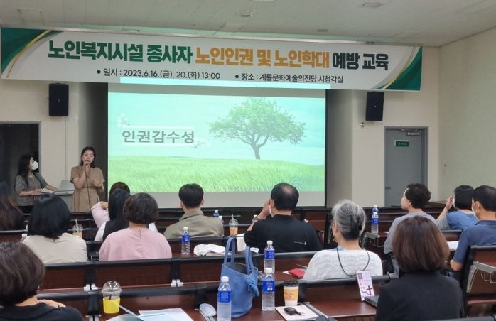 [제주교통복지신문 김강석 기자] 계룡시는 지난 16일과 20일 이틀에 걸쳐 계룡문화예술의전당에서 노인복지시설 및 장기요양기관 종사자(대표자‧시설장 등)를 대상으로 노인 인권 보호 및 장기요양급여 부당청구 예방을 위한 교육을 실시했다고 밝혔다.