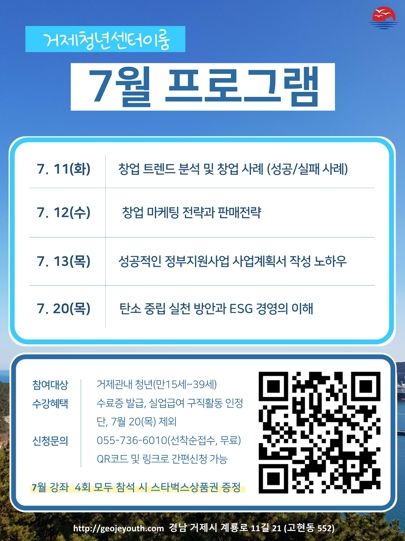 교육시간은 오전 10시 ~ 오후 1시까지로 강의당 15명 내외의 청년들을 선착순으로 모집하며 거제청년센터 이룸으로 전화 또는 방문하거나 링크주소 및 QR코드를 통해 신청 가능하다.