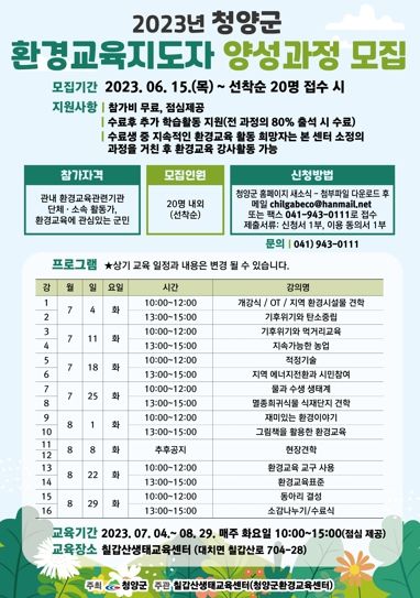 [제주교통복지신문 김강석 기자] 청양군이 지역적 특성을 살린 환경교육 분야의 우수한 지도자를 양성하고자 ‘2023년 청양군 환경교육지도자 양성과정’ 교육생을 모집한다고 20일 밝혔다.