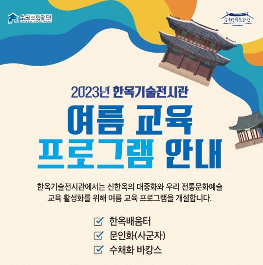 [제주교통복지신문 김강석 기자] 수원문화재단은 오는 7월 5일부터 8월 26일까지 한옥기술전시관에서 ‘2023년 여름 교육 프로그램’을 운영한다.