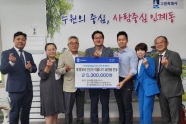 [제주교통복지신문 김강석 기자] 한화금융서비스 남수원지역단, ㈜신세대여행사/신세대투어, ㈜제이엠파트너스, 궁 잔기지떡, 아주대학교 경영대학원 총동문회 특임부회장 김영례는 지난 19일 인계동 행정복지센터에 금5,000,000원을 전달했다.