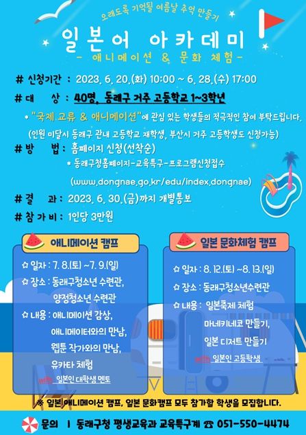[제주교통복지신문 김강석 기자] 부산 동래구가 오는 7~8월 일본 문화 및 애니메이션에 관심 있는 관내 고등학생을 대상으로 국제교류 문화아카데미로 '일본어 아카데미'를 운영한다.