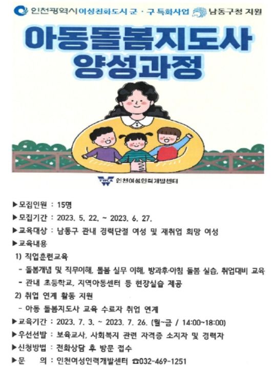 [제주교통복지신문 김강석 기자] 인천시 남동구는 지역 내 경력단절 및 재취업 희망 여성들을 대상으로 ‘아동 돌봄지도사 양성과정’을 운영한다고 20일 밝혔다.