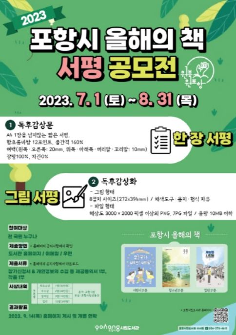 [제주교통복지신문 김강석 기자] 포항시는 7월 1일부터 8월 31일까지 두 달간 ‘2023 원 북 원 포항 서평 공모전’을 실시한다.