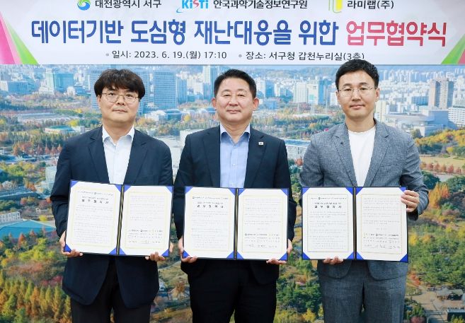 [제주교통복지신문 김강석 기자] 대전 서구는 구청 갑천누리실에서 한국과학기술정보연구원(KISTI), 라미랩(주)과 ‘데이터 기반 도심형 재난 대응’을 위한 업무협약을 체결했다고 20일 밝혔다.