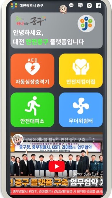 한편, '안전 중구' 플랫폼은 긴급상황(민방위대피, 무더위쉼터, 안전지킴이집, AED) 발생 시 언제·어디서든 가장 가까운 장소로 가는 최적의 경로를 실시간 안내해주는 플랫폼이다. 지난 4월 24일 중부경찰서·한국과학기술정보연구원·라미랩㈜가 업무협약을 체결해 구축 중으로, 오는 7월부터 12월 말까지 실증시험과 시범운영을 진행할 예정이다.