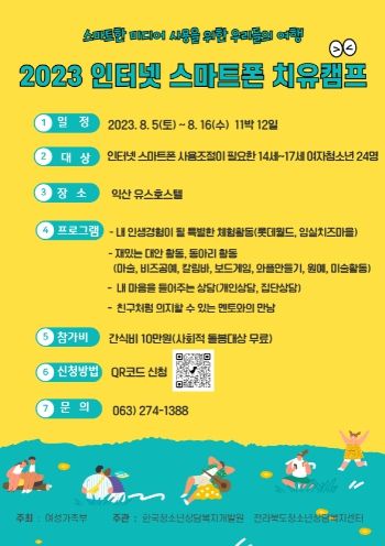모집은 7월 7일까지 선착순으로 진행하며, 전라북도청소년상담복지센터 누리집에서 신청서를 받아 이메일로 신청하거나 포스터 QR코드를 활용하면 된다.