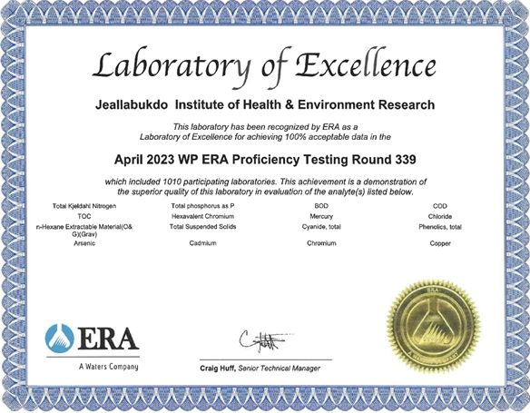 [제주교통복지신문 김강석 기자] 전라북도 보건환경연구원이 미국 환경자원학회가 주관한 국제공인 숙련도 시험에서‘우수기관(Laboratory of Excellence)’으로 평가받았다.