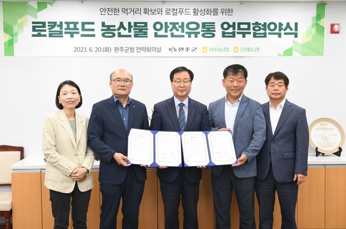 20일 완주군은 군청 전략회의실에서 유희태 완주군수, 송영욱 이서농협 조합장, 강신학 삼례농협 조합장이 참석한 가운데 로컬푸드 농산물 안전유통 업무협약을 체결했다.