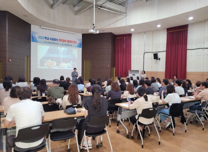 이번 연수는 학교시설공사 직접 집행에 따른 계약담당 공무원의 실무능력 향상에 초점을 두고, ▲공사 업종 선택 방법 및 실습 ▲건설산업기본법 해설(건설업역폐지, 대업종화, 주력분야 등) ▲질의회신 및 사례 위주의 실무처리 과정을 안내해 학교현장에 도움을 주는 데 중점을 뒀다.