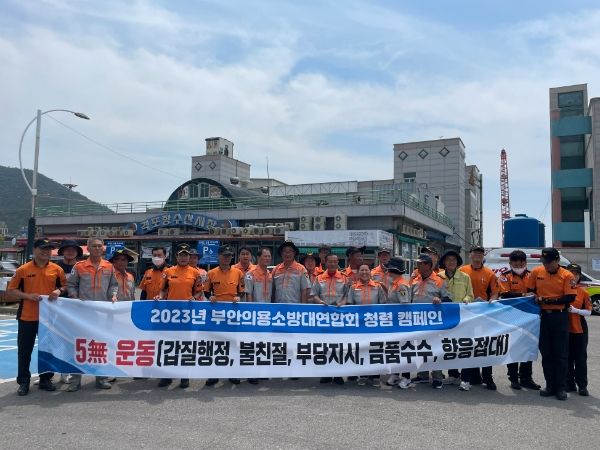 안전총괄과 직원과 부안의용소방대연합회, 부안소방서 30명이 참석한 가운데 부안 5無 운동(갑질행정, 불친절, 부당지시, 금품수수, 향응접대) 실천 캠페인을 실시하며 청렴한 부안 만들기에 적극 동참할 것을 홍보했다.