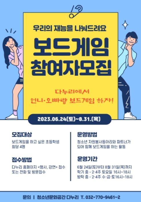지난 6월 3일부터 10일까지 '다누리'에 모여 보드게임의 방법과 규칙에 대한 기본교육을 마친 청소년들이 지역 초등학생과 '다누리' 이용자들을 위해 게임을 안내하고 게임 방법을 알려주는 게임 파트너로 봉사를 진행할 예정이다.
