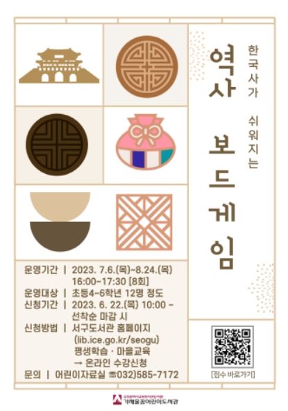 [제주교통복지신문 김강석 기자] 인천광역시교육청서구도서관은 가재울꿈어린이도서관에서 인천교육 7대 역점사업 중 하나인 ‘읽·걷·쓰’ 문화조성을 위한 어린이 독서교육 지원을 위해 초등 4~6학년 어린이를 대상으로 7월 6일부터 8월 24일까지 '한국사가 쉬워지는 역사 보드게임' 프로그램을 운영한다고 20일 밝혔다.