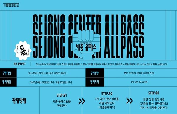 '2023 세종 올패스' 구입을 위해서는 먼저 청소년(8세~25세: 2016년생~1999년생) 본인이 세종문화회관 홈페이지 회원에 가입해야 한다. 1인 2매까지 구매 가능하며, 동반 관람(1인)에 대해서는 별도 제한 없이 공연관람 가능 연령이상이며 누구나 함께 관람할 수 있다. '2023 세종 올패스' 구매를 마친 후에는 반드시 공연별 관람 날짜와 좌석을 지정해야 하며, 공연 당일 티켓 수령을 위해 구매자 본인이 청소년임을 증빙할 수 있는 증빙서류(학생증, 신분증 등)가 필요하다.