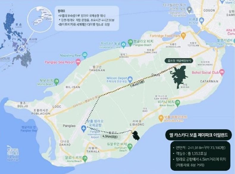 보홀 팡라오섬 일대 대지면적 약 132만㎡ 부지에 복합리조트단지 ‘엘카스카디 제이파크 보홀’을 짓는 사업이다. 호텔, 리조트, 풀빌라 등 총 1353실과 필리핀 최대 규모 워터파크, 27홀 골프장 등으로 구성된다.