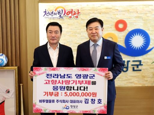 [제주교통복지신문 김강석 기자] ㈜비투엘물류 김창호 대표이사가 지난 16일 영광군수실을 방문하여 고향사랑기부금 최고액인 5백만 원을 기부했다.
