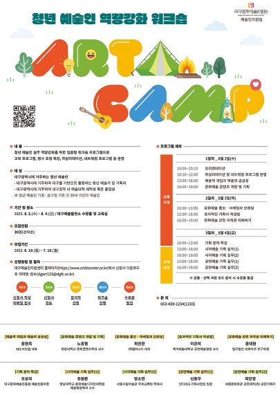 모집 기간은 6월 19일~7월 10일까지 선착순 30명을 모집하며, 강의는 8월 2일~8월 4일까지 대구예술발전소 수창홀 및 교육실에서 오전 10시부터 오후 7시까지 운영된다.