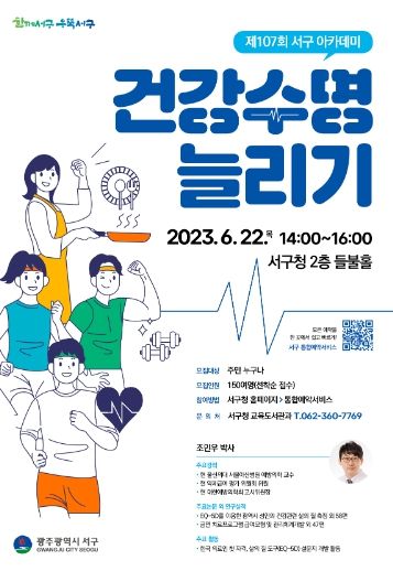 [제주교통복지신문 김강석 기자] 광주광역시 서구는 오는 22일 조민우 울산의대 서울아산병원 예방의학 교수를 초청해 ‘건강수명 늘리기’라는 주제로 제107회 서구 아카데미를 개최한다.
