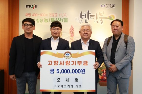㈜오피코리아는 지난 2012~2014년, 그리고 올해 무주반딧불축제를 대행하고 있는 업체로 고향사랑 기부를 통해 무주군 발전에 기여하고 싶다는 뜻을 밝혔다.