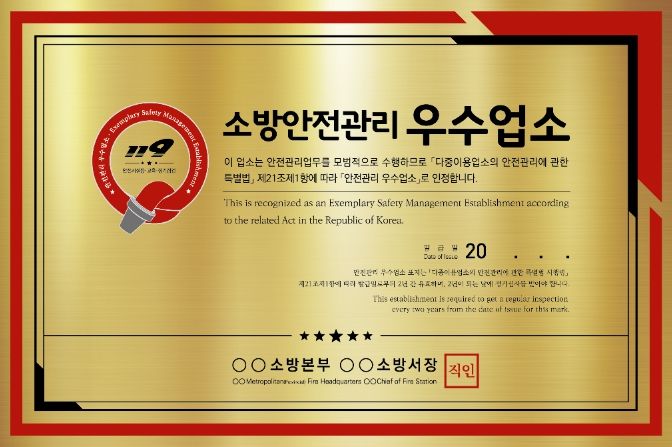 우수업소 인증제는 ‘다중이용업소의 안전관리에 관한 특별법’에 따라 영업주의 자긍심 고취와 자율 소방 안전관리 정착‧유도를 도모하기 위해 운영하는 제도이다.