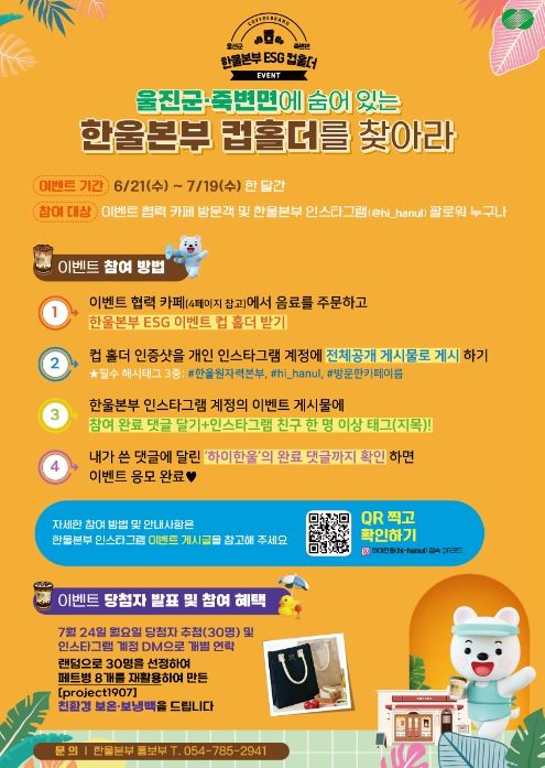한울본부는 지난 19일 원전 주변 지역 카페 11곳에 무표백 재생용지 테이크아웃 컵홀더 3만 매를 전달했으며, 지역 카페에서 음료 구매 시 제공되는 친환경 컵홀더 사진을 개인 인스타그램에 게시하고 친구 한 명 이상을 태그하면 이벤트에 참여하게 된다. 한울본부는 참여자 중 30명을 추첨하여 페트병을 재활용해서 만든 친환경 보온·보냉백을 증정한다. 자세한 이벤트 참여 방법 및 협력 카페 목록은 한울본부 인스타그램(@hi_hanul)에서 확인할 수 있다.