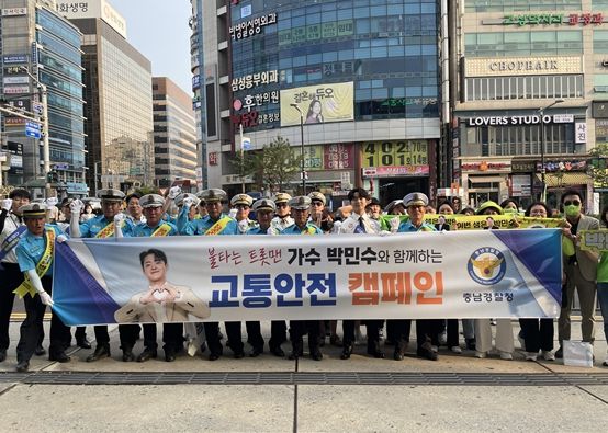 천안동남경찰서에 따르면 명예경찰 박민수와 더불어 충남경찰청 교통안전계, 천안동남경찰서 교통관리계, 천안동남 모범운전자회 및 박민수 팬클럽 등 40여명이 참석한 가운데 보행자 안전 및 우회전 통행방법을 홍보하는 합동 캠페인을 펼쳤다고 밝혔다.