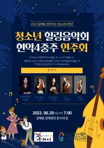 [제주교통복지신문 김강석 기자] 구리시청소년재단(대표이사 강종일) 청소년수련관은 오는 6월 29일 갈매동 갈매광장 분수대 앞에서 찾아가는 문화행사인 ‘청소년 힐링음악회’를 운영한다.