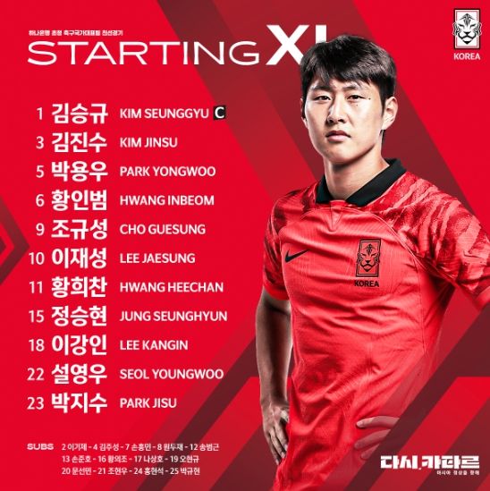 지난 경기에서 4-4-2 포메이션을 실험했던 클린스만 감독은 3월 A매치 2연전에서 활용했던 4-2-3-1 포메이션을 다시 꺼내들었다. 최전방 공격수로 조규성이 나서며 왼쪽 날개는 이강인, 오른쪽 날개는 황희찬이 맡는다.