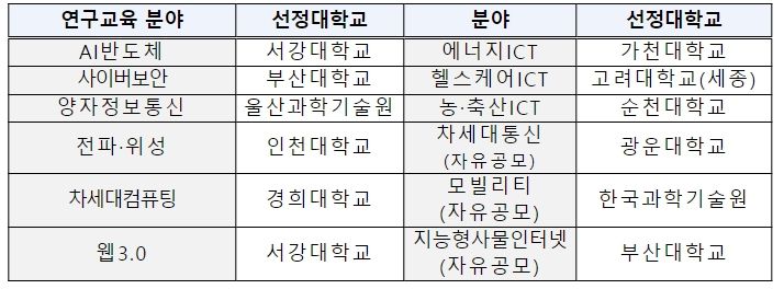 올해는 국가 전략기술 및 산업 수요가 높은 분야인 △인공지능반도체, △사이버보안, △양자정보통신, △전파·위성, △차세대컴퓨팅, △웹3.0, △에너지-ICT, △헬스케어-ICT, △농축산-ICT, △자유공모(3개) 과제에서 서강대, 경희대, 순천대 등 총 12개 대학이 선정됐다.