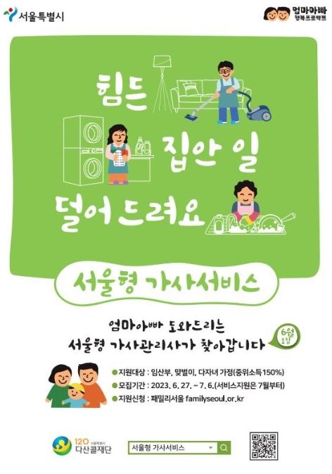 ‘서울형 가사서비스’는 임산부 가정의 건강한 출산을 돕고, 맞벌이 및 다자녀 가정에는 아이와 더 많은 시간을 보낼 수 있도록 집안일을 도와줌으로써 일과 가정의 균형을 지원하는 사업이다. 청소, 설거지, 빨래, 쓰레기 배출 등의 가사서비스를 회당 4시간씩(휴게시간 30분 포함), 총 6회 무료로 이용할 수 있다.