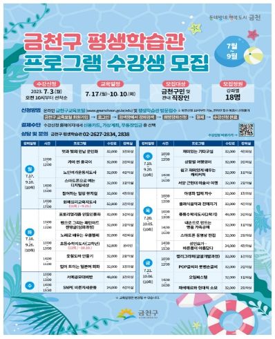프로그램은 7월 17일부터 10월 10일까지 과정별로 10~11회 운영한다. 프로그램에 참여하고자 하는 구민은 금천구 교육포털에서 온라인으로 수강 신청을 하거나, 금천구 평생학습관에 방문해 신청할 수 있다.