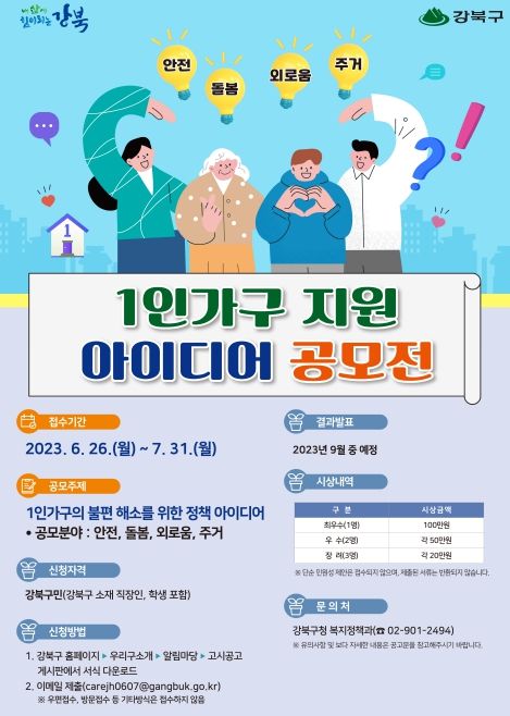 [제주교통복지신문 김강석 기자] 서울 강북구는 1인가구 지원 정책을 발굴 및 시행하기 위해 오는 26일(월)부터 7월 31일(월) 오후 6시까지 1인가구 지원 정책을 공모한다고 밝혔다.