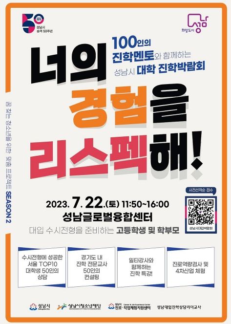 [제주교통복지신문 김강석 기자] 성남시는 오는 7월 22일 오전 11시 50분~오후 4시 성남글로벌융합센터(수정구 시흥동)에서 대학 진학박람회를 개최한다.