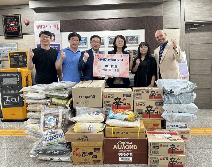 루터대는 지난해 2월 상갈동 지역사회보장협의체와 ‘행복꾸러미 지원 사업’ 업무 협약을 체결하고, 학생의 자발적 기부로 모인 쌀과 라면을 기탁하고 있다.