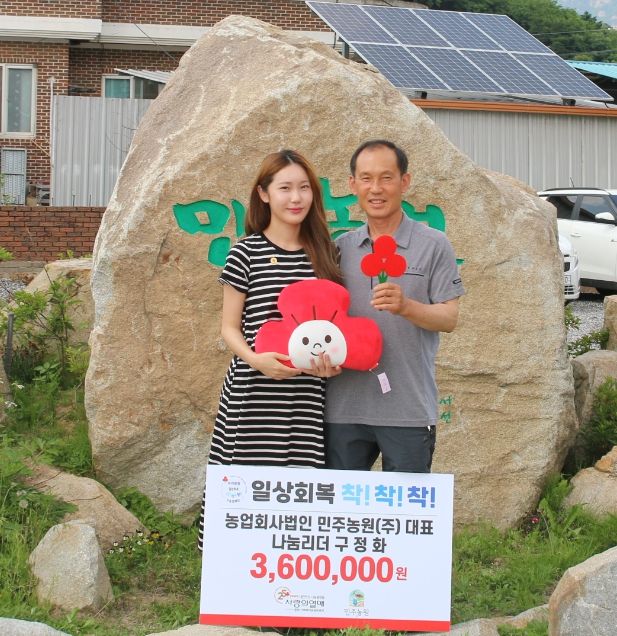 [제주교통복지신문 김강석 기자] 보은군 마로면에 소재한 농업회사법인 민주농원(주)은 지난 20일 군내 저소득층 지원을 위한‘우리충북 일상회복 착!착!착! 나눔캠페인’에 현금 360만원(1년간 월30만 원씩 정기기부)을 지정 기탁하고 충북사회복지공동모금회‘나눔리더’회원으로 정식 가입했다.