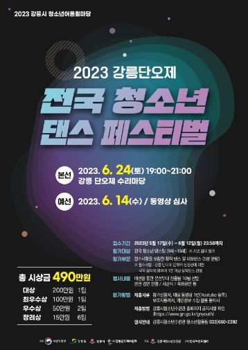 [제주교통복지신문 김강석 기자] 강릉시청소년수련관은 오는 24일 오후 7시 강릉단오제 수리마당에서 ‘2023 강릉단오제 전국 청소년 댄스페스티벌’을 개최한다.