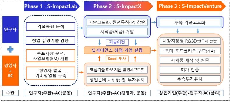 고난도의 과학기술이 필요한 신성장 분야에 대해 연구자와 경영자가 각자의 장점과 역량을 살려서 딥사이언스 창업 기업을 설립하고, 연구산업 기업과의 협력 및 파트너십을 촉진하여 기업 성장을 가속화 하는 등 딥사이언스 분야의 기술혁신과 창업을 병행 지원한다.