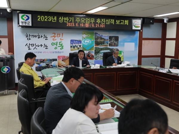 군에 따르면 영동군은 지난 19일과 21일 양일간 군청 상황실에서 정영철 영동군수 주재로 부서별 2023년 상반기 주요업무 추진실적 보고회를 가졌다.