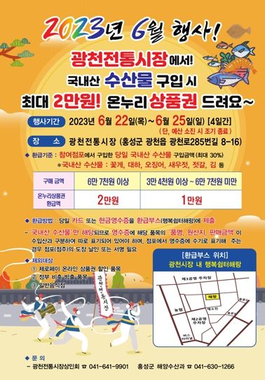 행사는 오는 6월 22일(목)부터 25일(일)까지 4일간 광천전통시장에서 시행되며, 행사참여점포(74개소)에서 당일 국내산 수산물을 구입하면 최대 30%(1인 2만원 한도)까지 온누리상품권으로 환급해주는 방식으로 진행된다.